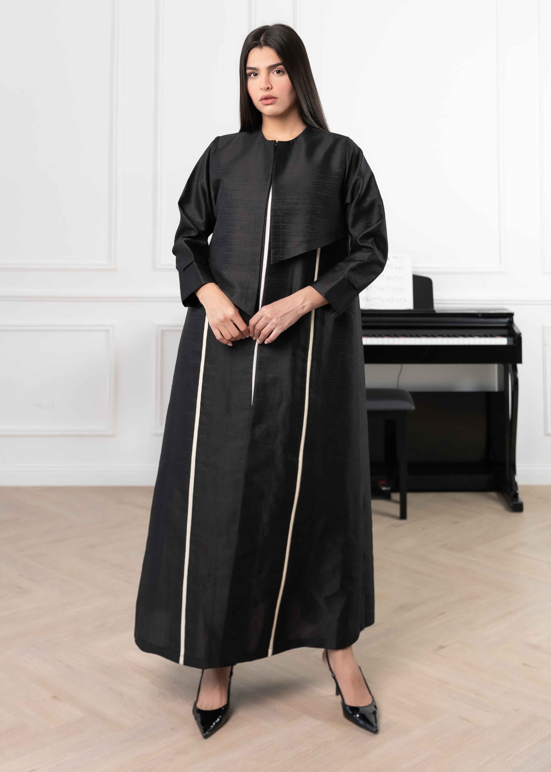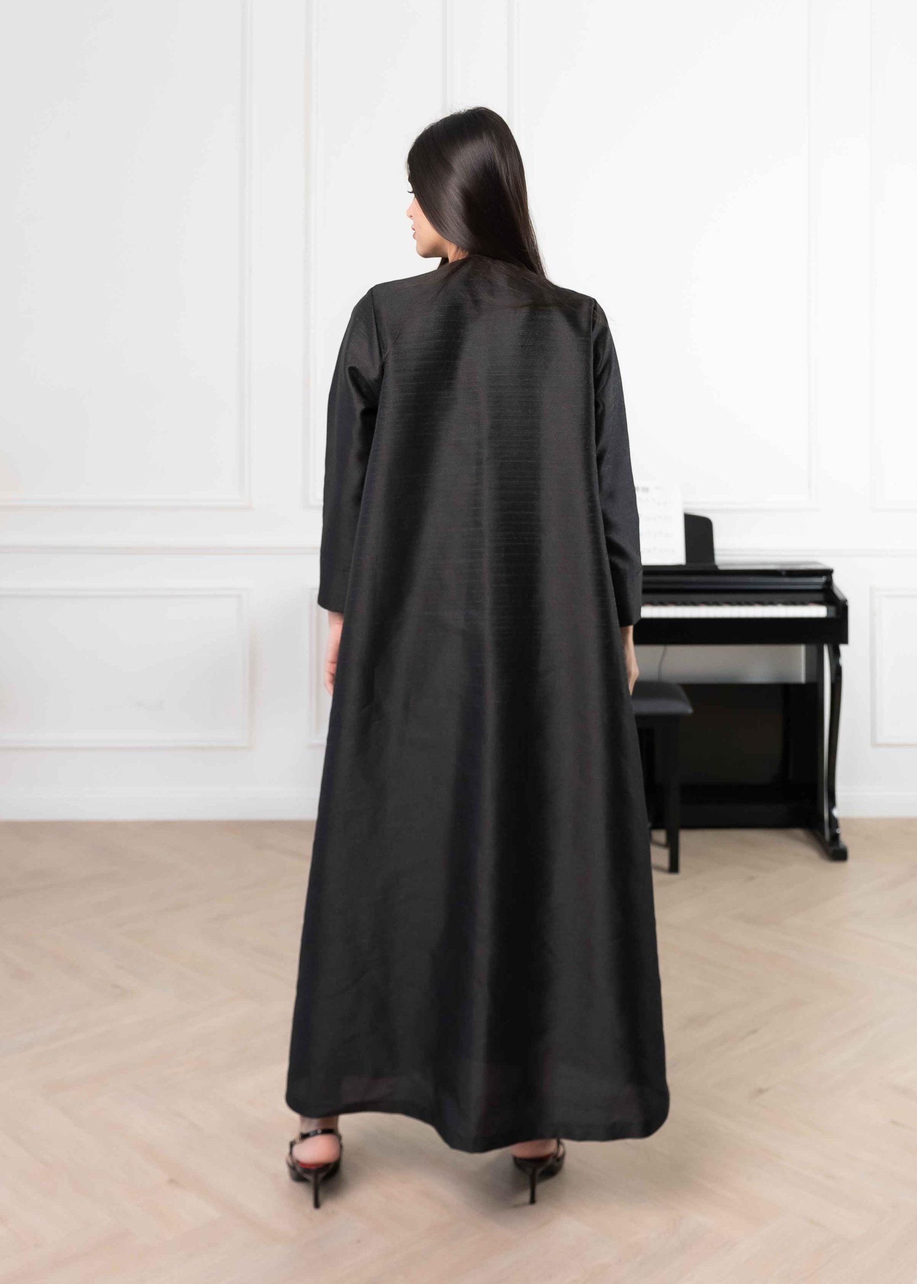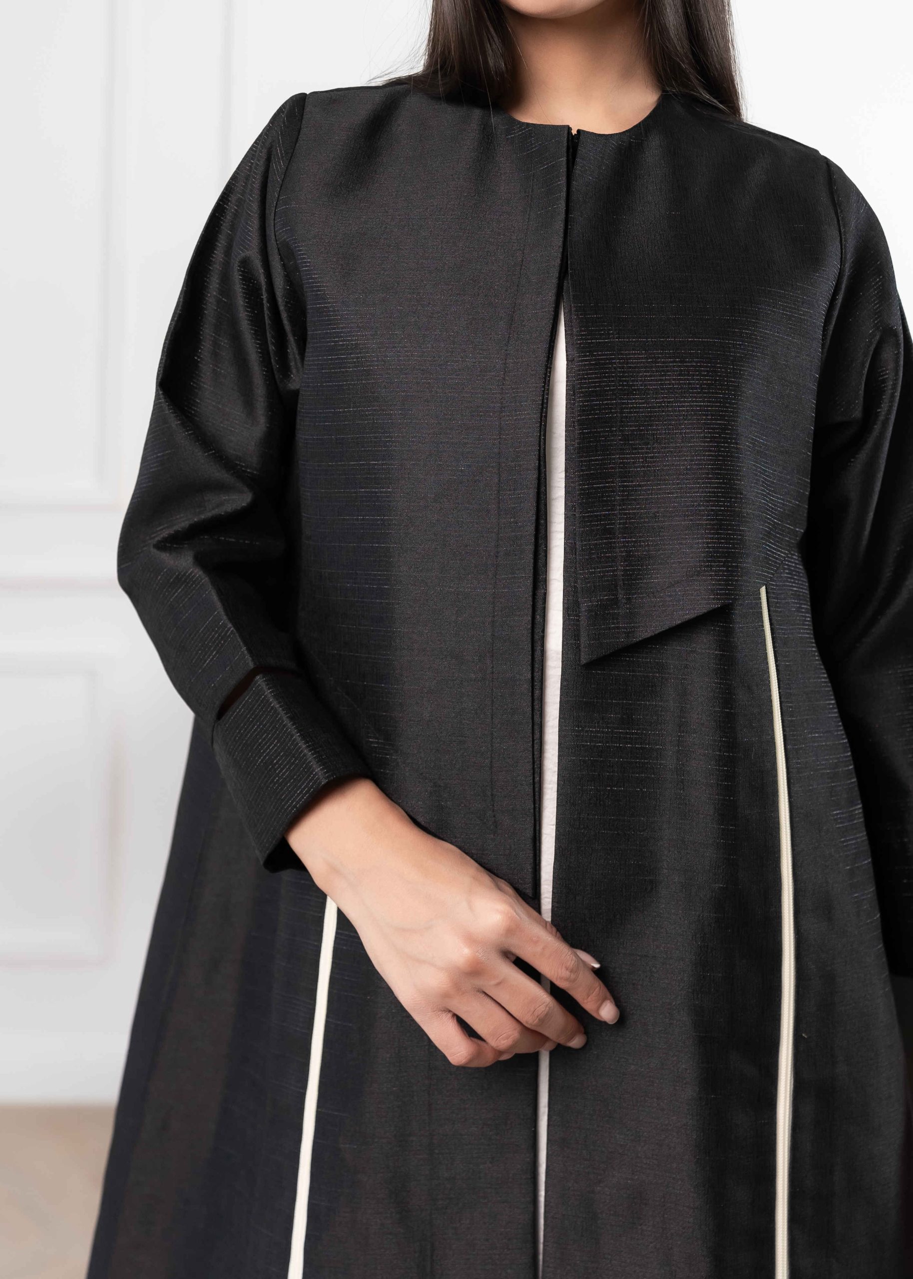 Its subtle texture gives the abaya a luxurious feel while keeping the overall look minimal and refined.