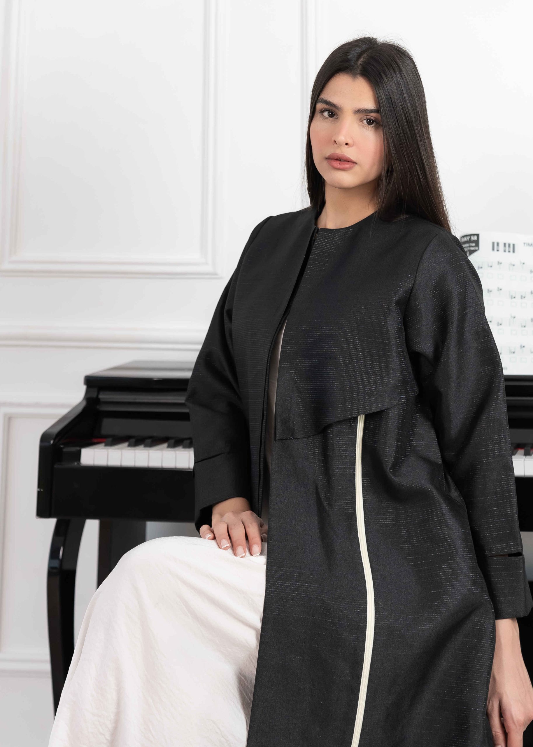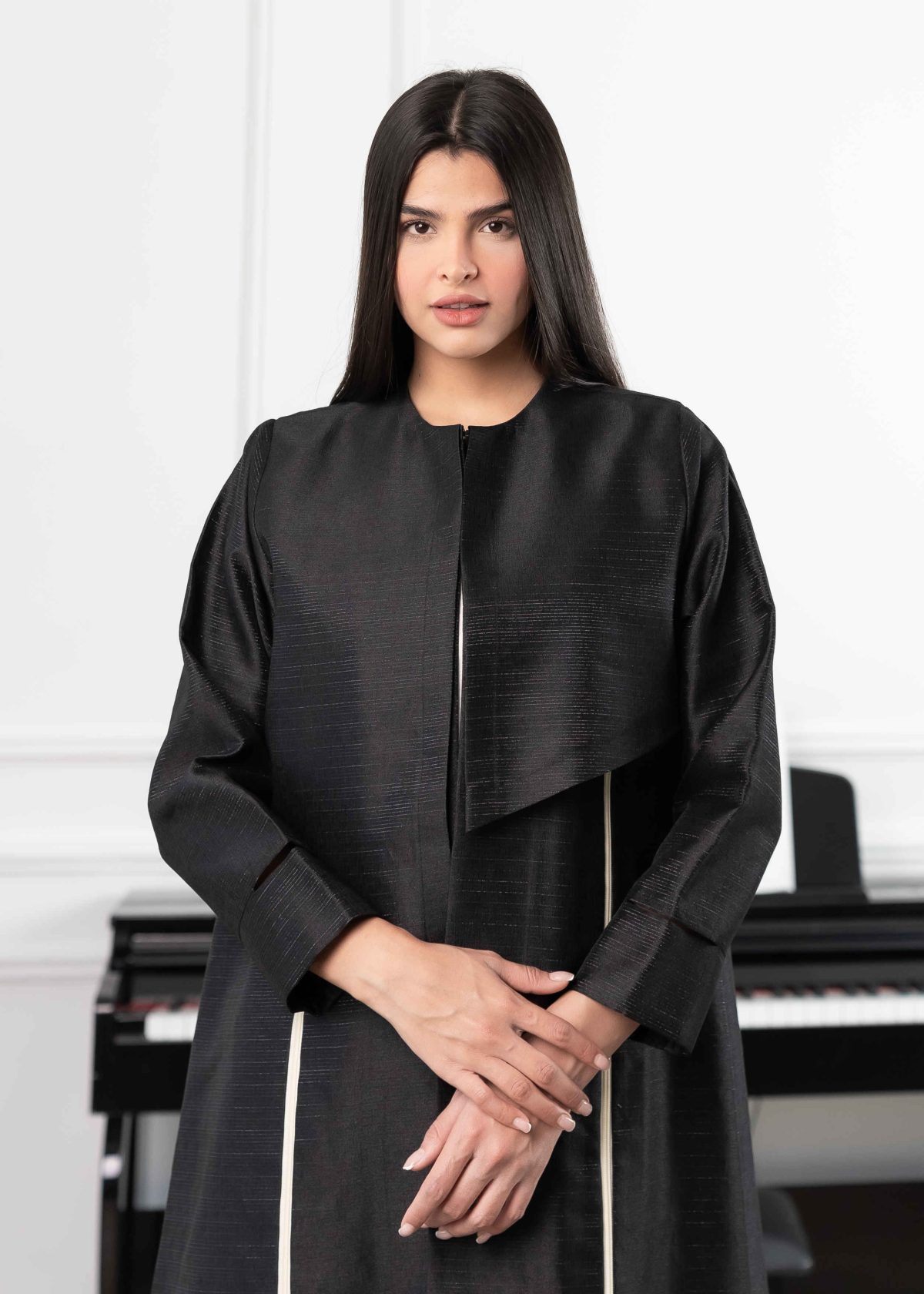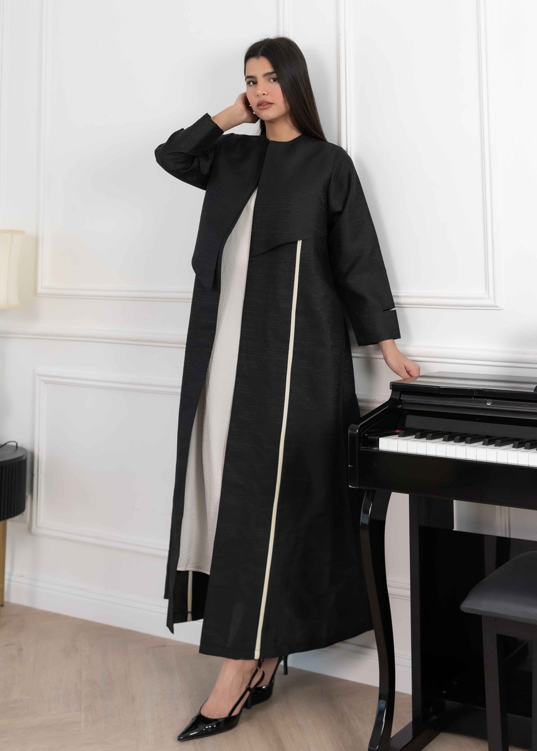 Its subtle texture gives the abaya a luxurious feel while keeping the overall look minimal and refined.
