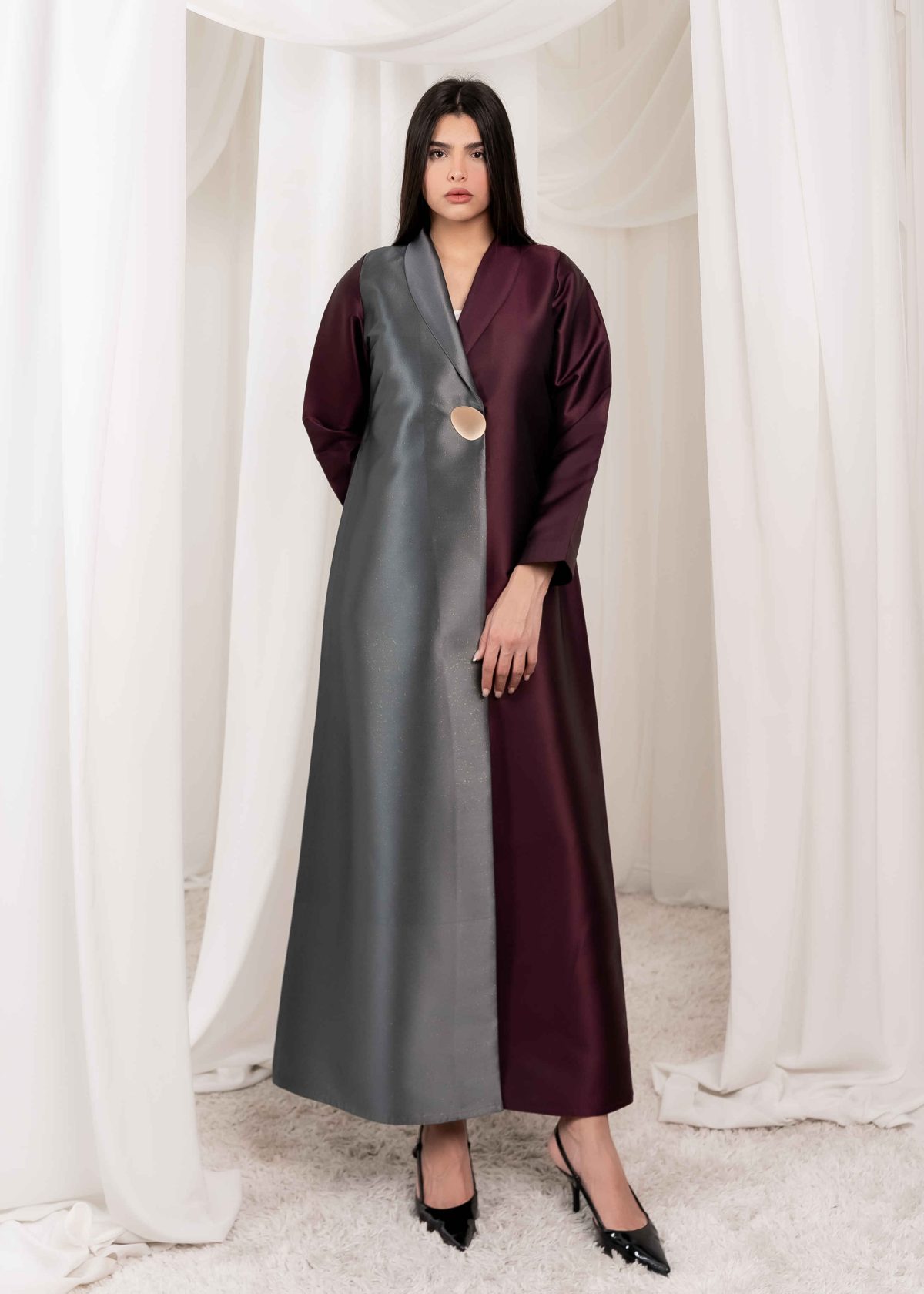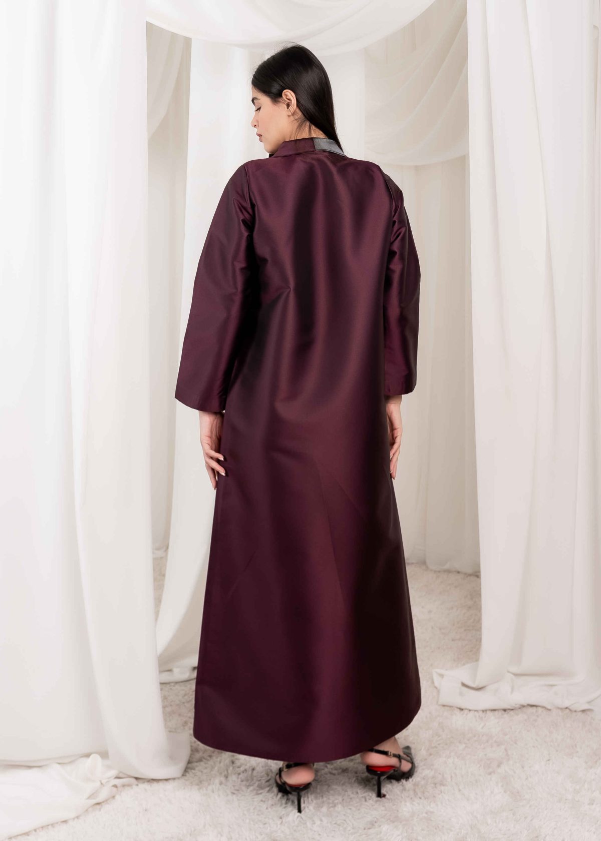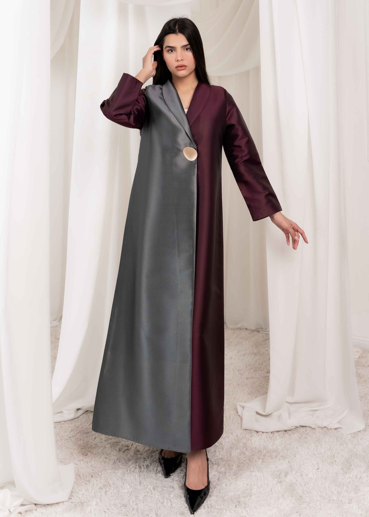 The design balances minimalism and luxury, allowing the fabric itself to take center stage. Its clean lines and well-structured silhouette give the abaya a royal and graceful feel without being overstated. Every detail is carefully considered to maintain a polished and elegant appearance.