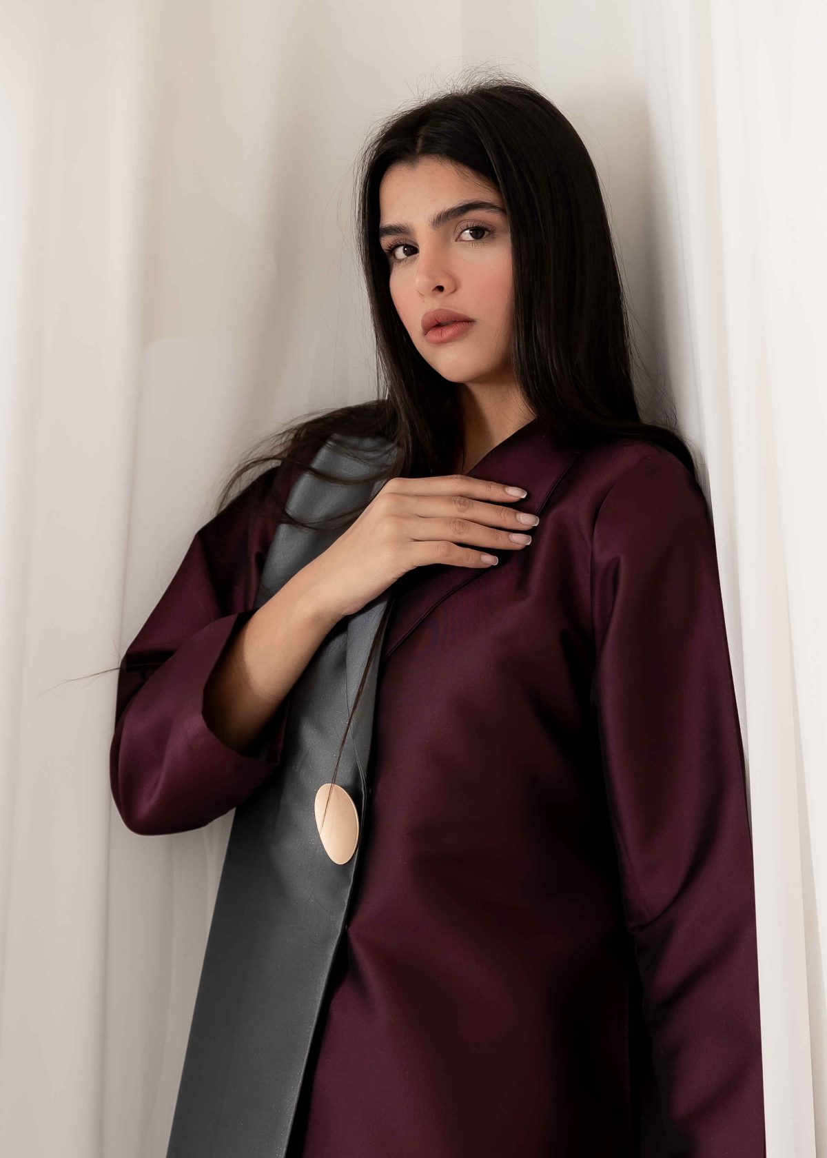 Crafted from high-quality Turkish fabric, the DIANA Abaya stands out for its smooth texture and excellent durability. The fabric features a sophisticated blend of purple and grey tones, enhanced with subtle gold particles that gently catch the light. This natural-inspired color harmony creates a calm yet luxurious visual effect.