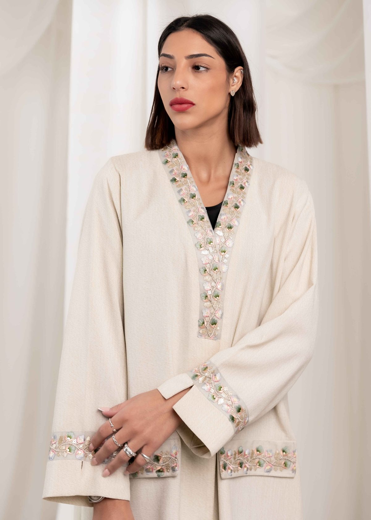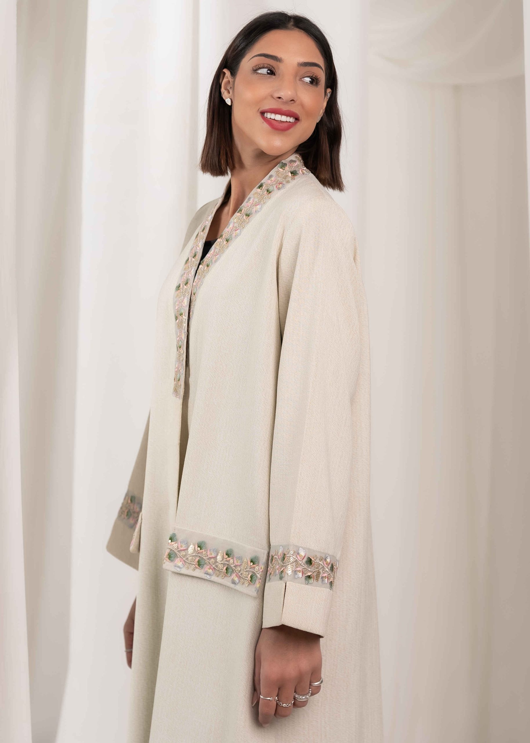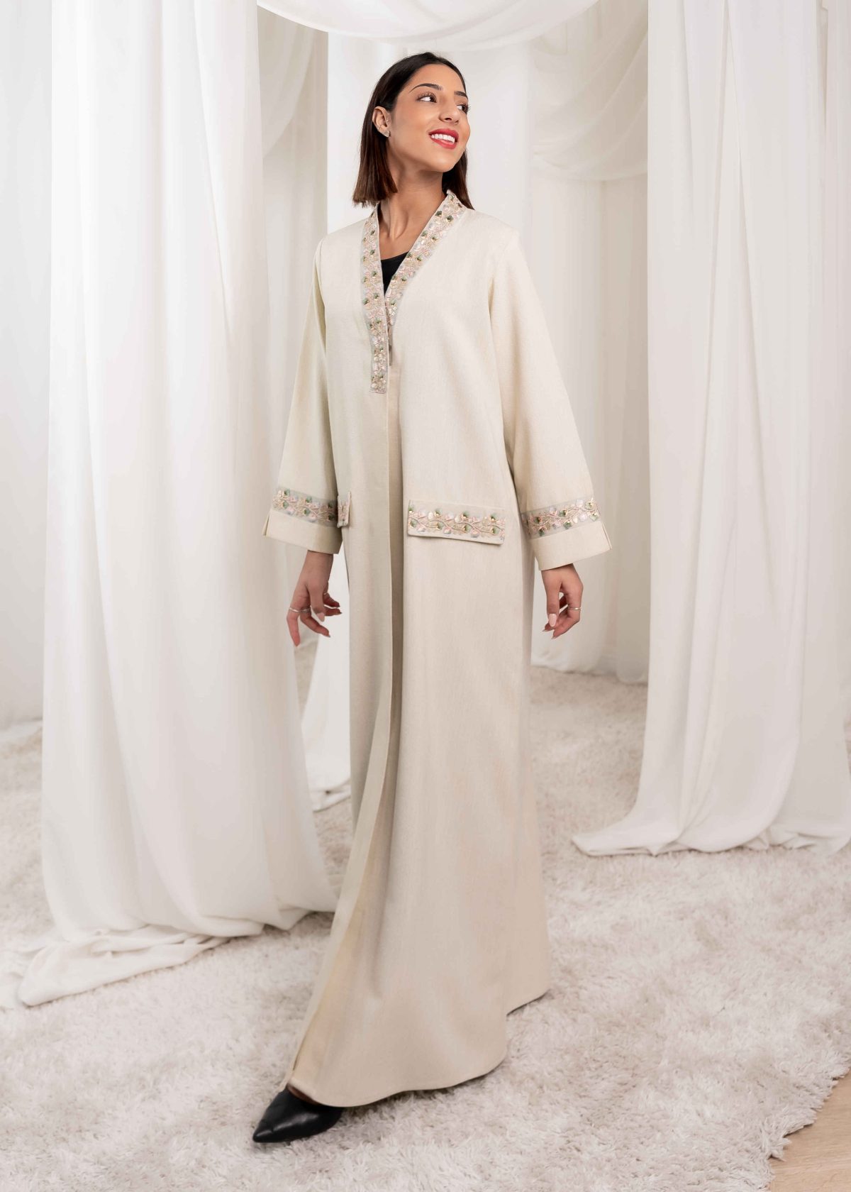 Crafted with high-quality fabric and precise tailoring, Rabee’ offers a comfortable fit with a graceful flow. The stitching is neat and refined, reflecting attention to detail and craftsmanship. The neutral tone allows easy styling and makes this abaya suitable for everyday wear as well as more formal settings.
