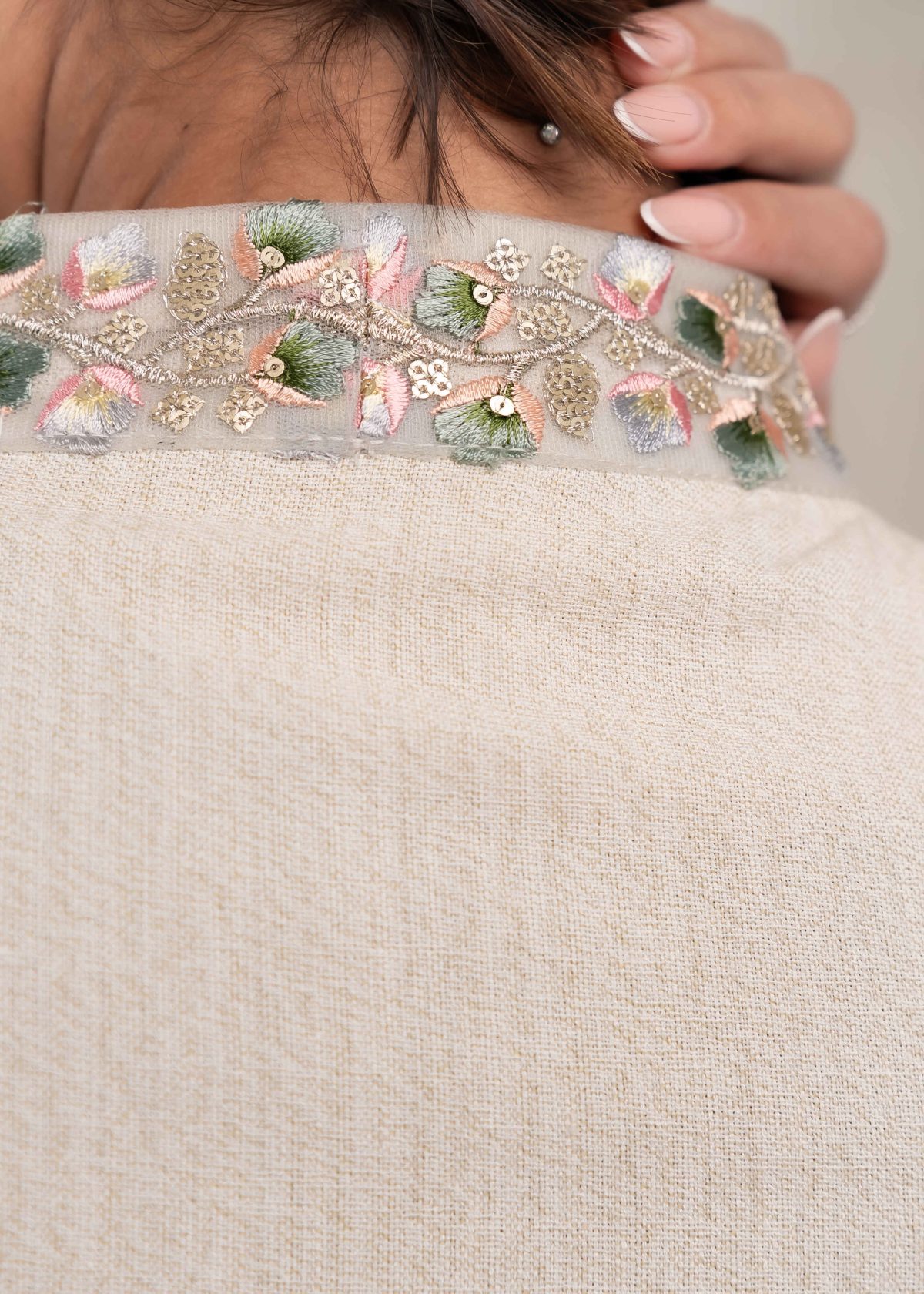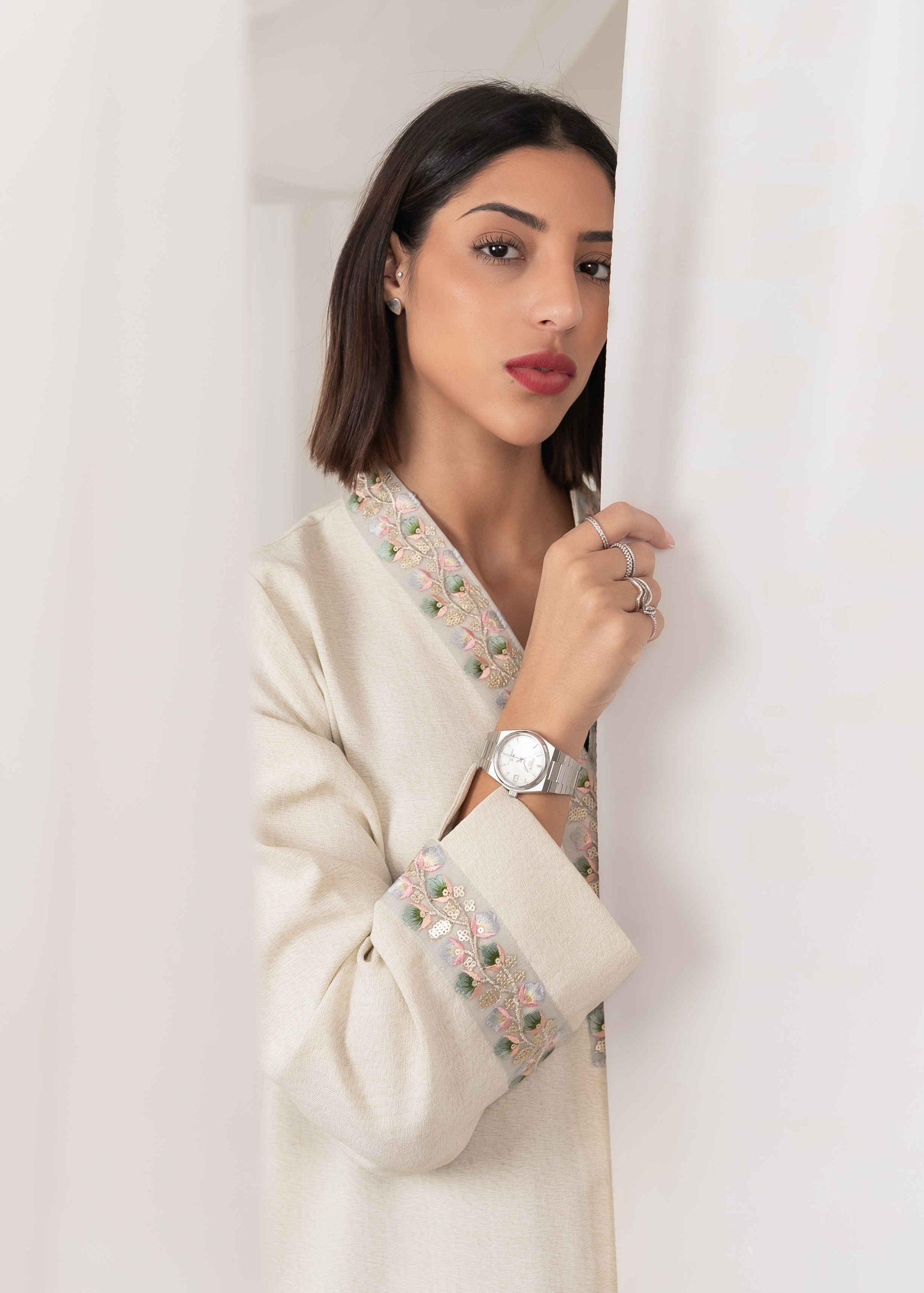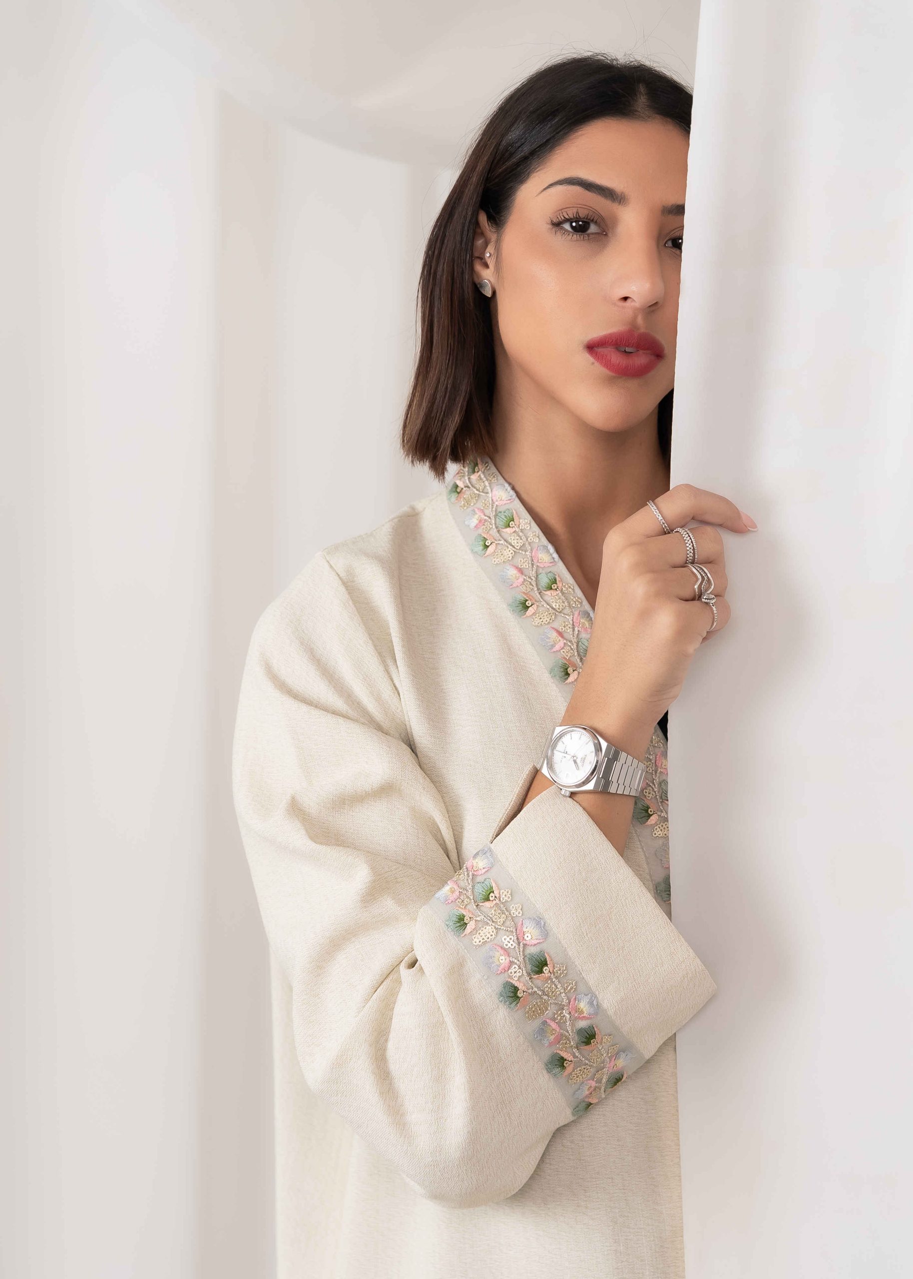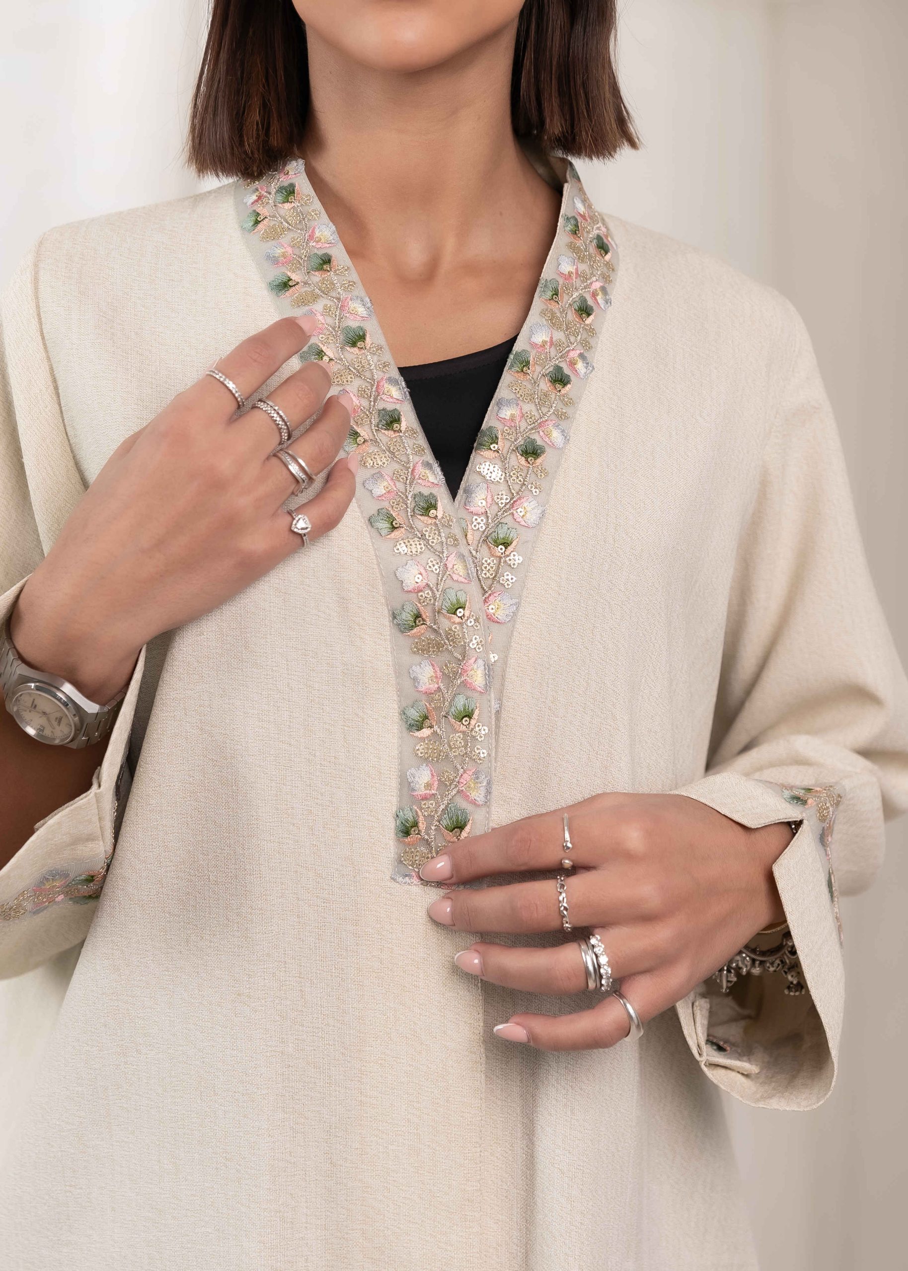 Crafted with high-quality fabric and precise tailoring, Rabee’ offers a comfortable fit with a graceful flow. The stitching is neat and refined, reflecting attention to detail and craftsmanship. The neutral tone allows easy styling and makes this abaya suitable for everyday wear as well as more formal settings.