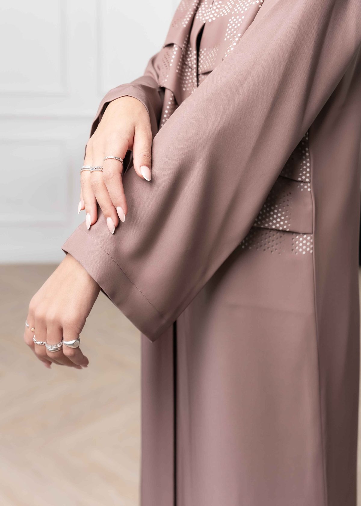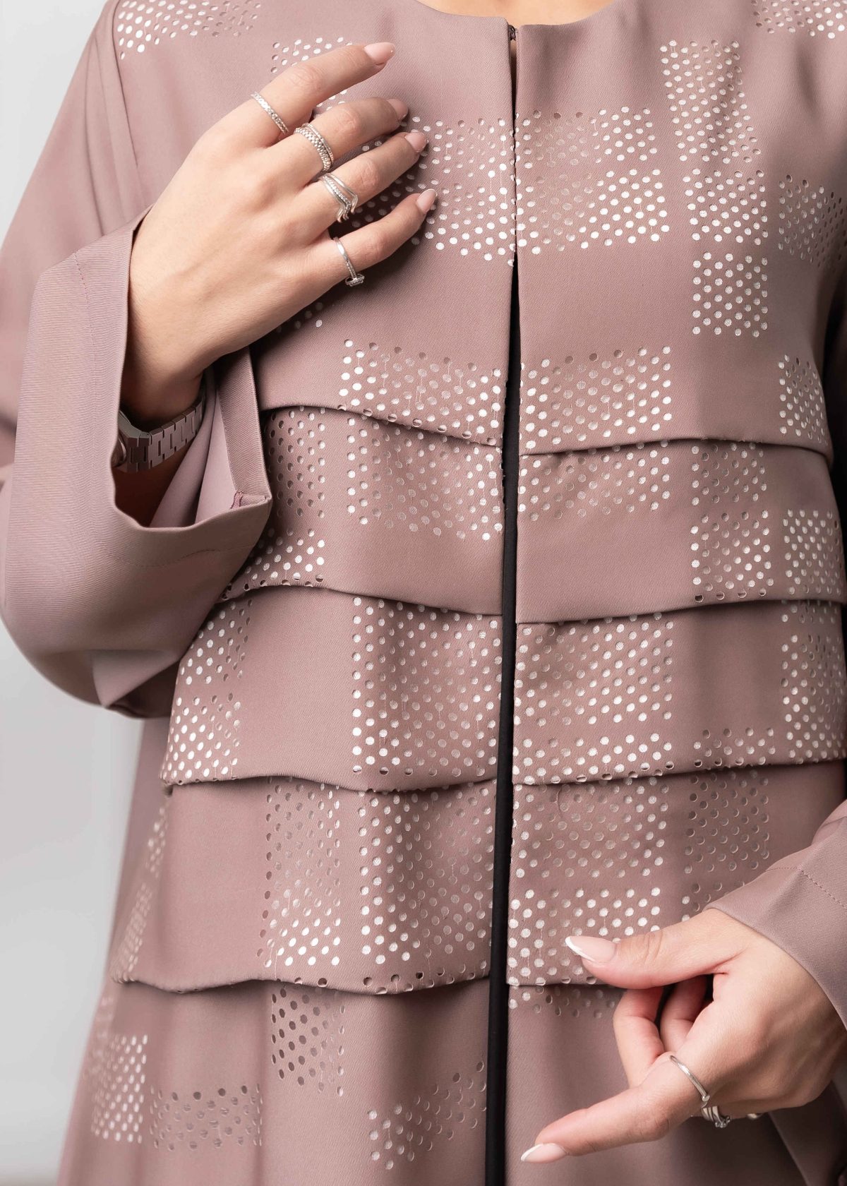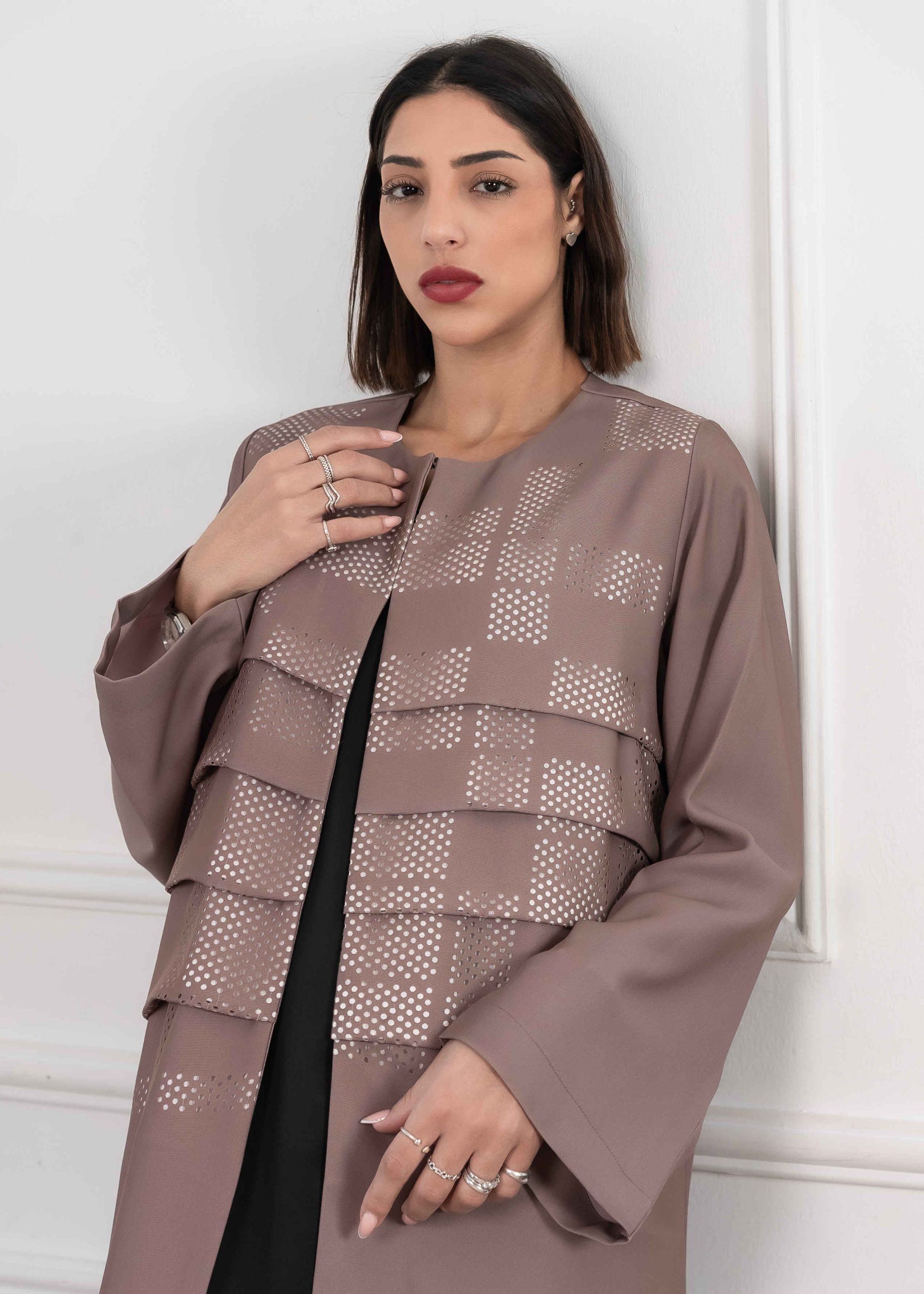 Crafted from high-quality crepe fabric, the Sofia Abaya features a laser-cut pattern that adds a subtle artistic touch and creates a truly unique appearance. The laser detailing gives the abaya depth and texture while keeping the overall design soft and elegant.